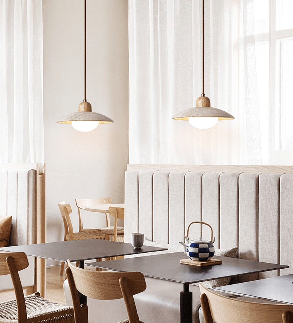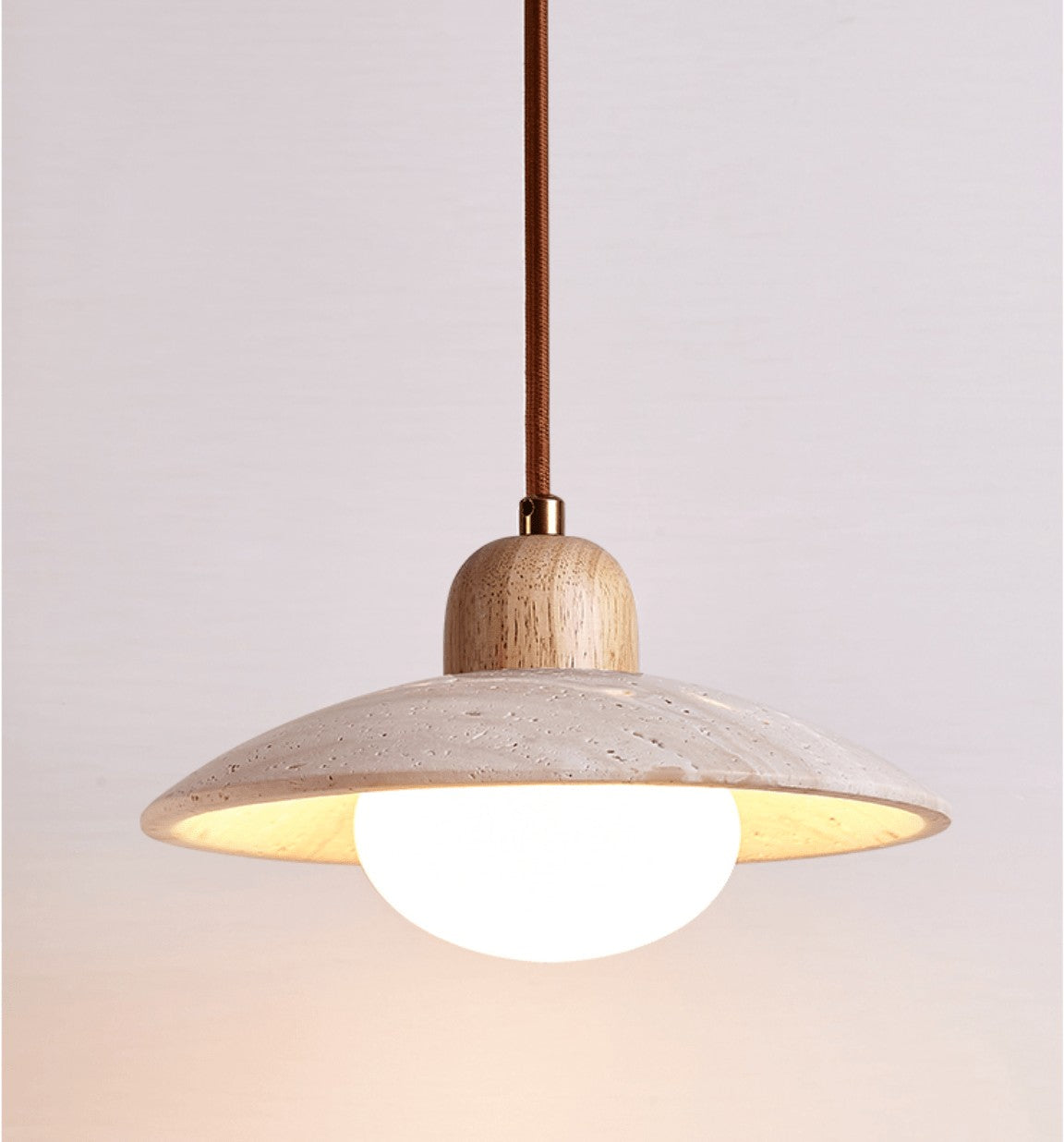 This pendant light celebrates natural materials in their purest form. A softly curved travertine dome is paired with a warm wooden accent and a glowing opal sphere, creating a calming, grounded presence overhead. Each stone shade carries its own natural markings, making every piece subtly unique. Ideal for kitchens, dining tables, or quiet corners where soft, atmospheric light feels most at home.