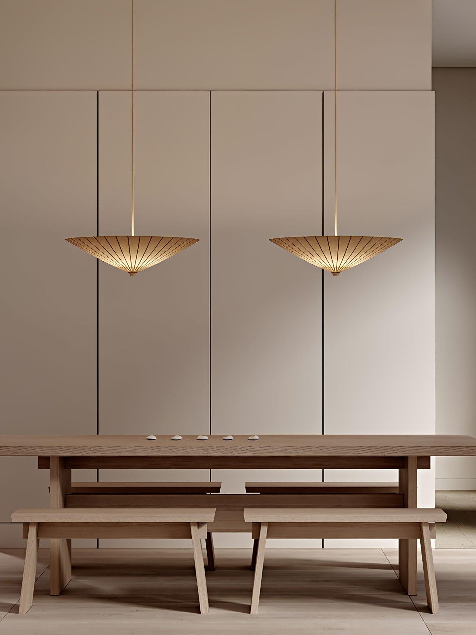 Soft and calming, this pendant light echoes the gentle curve of a classic parasol. The fabric shade filters light beautifully, creating a relaxed, inviting atmosphere over dining tables or seating areas. With its generous scale and neutral tones, it brings warmth and elegance without overpowering the space.